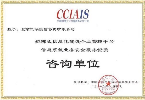Chinese Communications Industry Association Information Security Association awarded Beijing Sanlian Hanson Consulting Co. Ltd. matrix information construction enterprise management information system platform for business security services qualification consultants, the company officially launched the qualification of safety service information system for business operations.